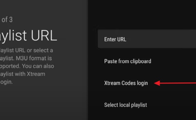 TiviMate vous demandera d’ajouter une liste de lecture à l’aide d’un lien M3U, d’un code Xtream ou du portail Stalker. Sélectionnez Xtream code. Dans ce tutoriel, nous utiliserons le xtream code pour lire un service IPTV dans l’application TiviMate.